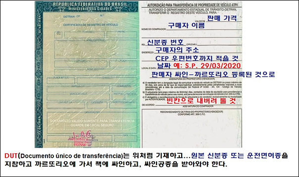 이 DUT (Documento único de transferência)는 다른 말로 CRV (Certificado de Registro do Veículo)라고도 하며... (지금은 CLV라는 말을 자주 쓴다)